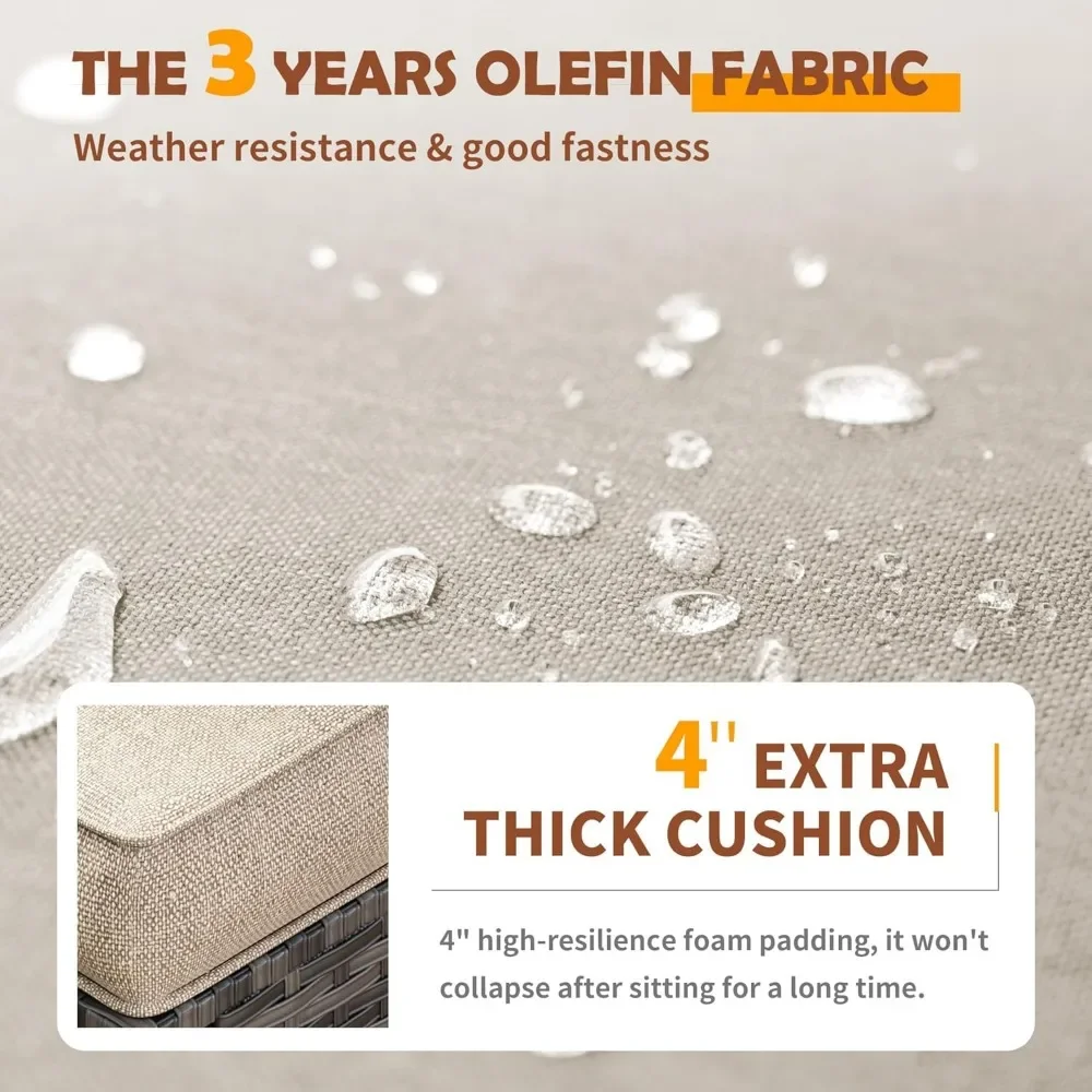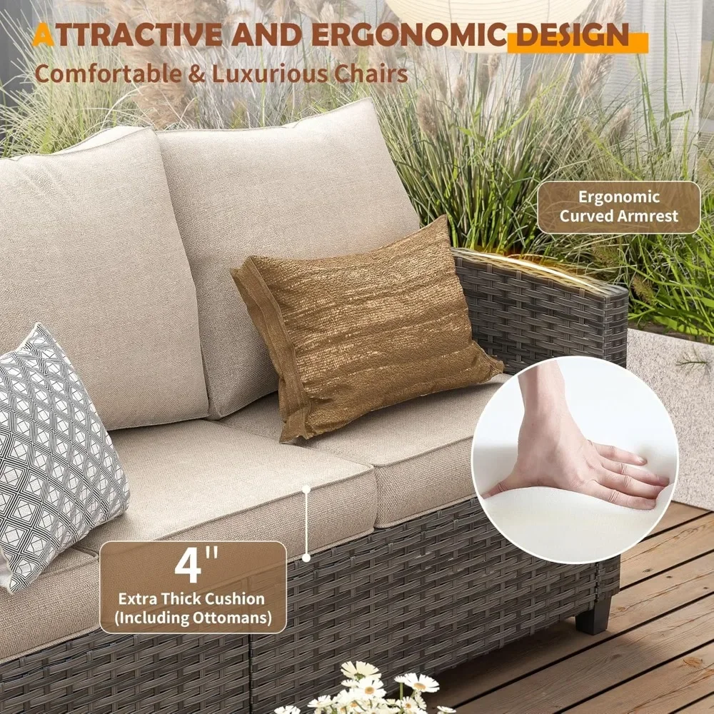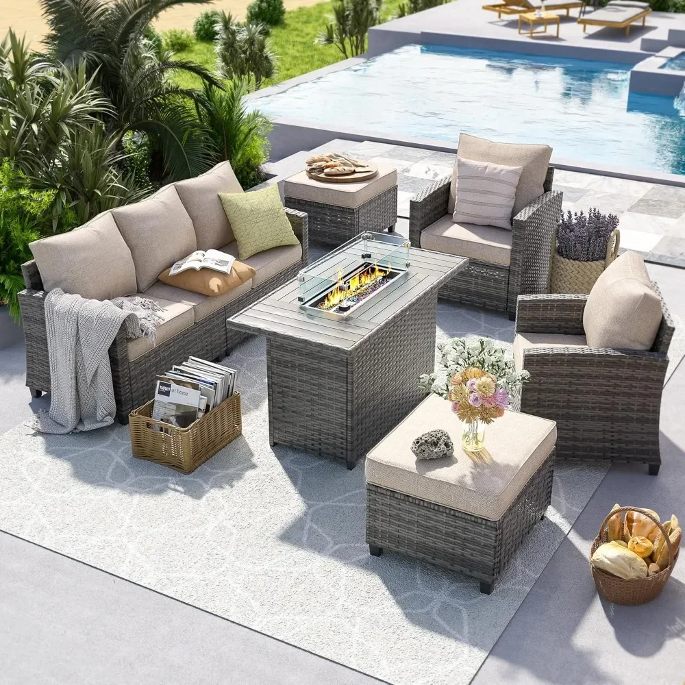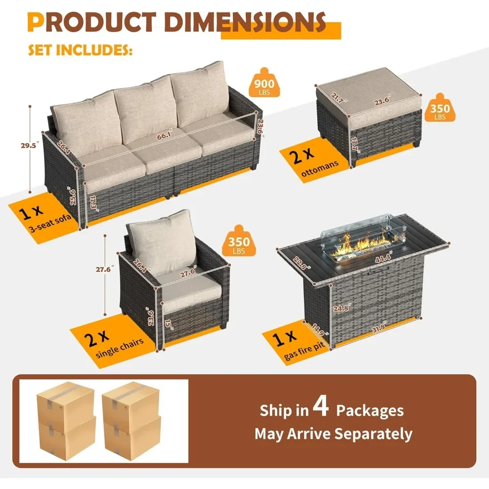 This 6-piece patio furniture set with a 44″ fire pit table is the perfect combination of comfort, style, and functionality for your outdoor living space. Crafted from durable all-weather wicker rattan, it is built to withstand the elements while maintaining its modern appeal. The set includes a spacious sofa, ottomans, and plush cushions that provide maximum comfort for family gatherings or evening relaxation. The centerpiece is a rectangular fire pit table that not only keeps you warm on cool nights but also doubles as a functional table for food and drinks. The ottoman design offers flexible seating or can be used as a footrest for added lounging comfort. With its sturdy construction, weather-resistant materials, and elegant design, this set transforms any patio, deck, or garden into a welcoming retreat. Perfect for year-round entertaining, it creates a cozy ambiance that brings people together in style.